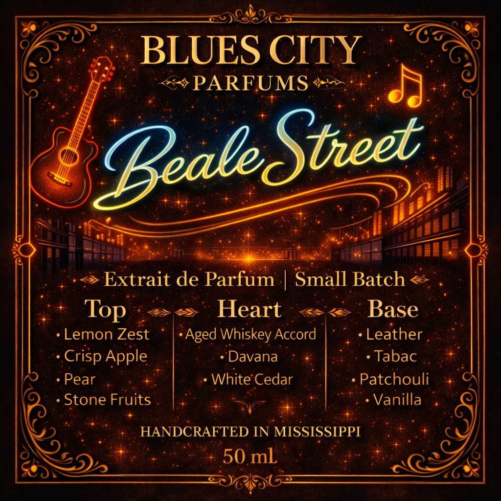 At the heart, a smooth aged whiskey accord dances with davana and white cedar, capturing the spirit of Southern bars and blues-filled air. As it dries down, leather, tobacco, and earthy patchouli blend with warm vanilla — deep, dirty, and unforgettable.